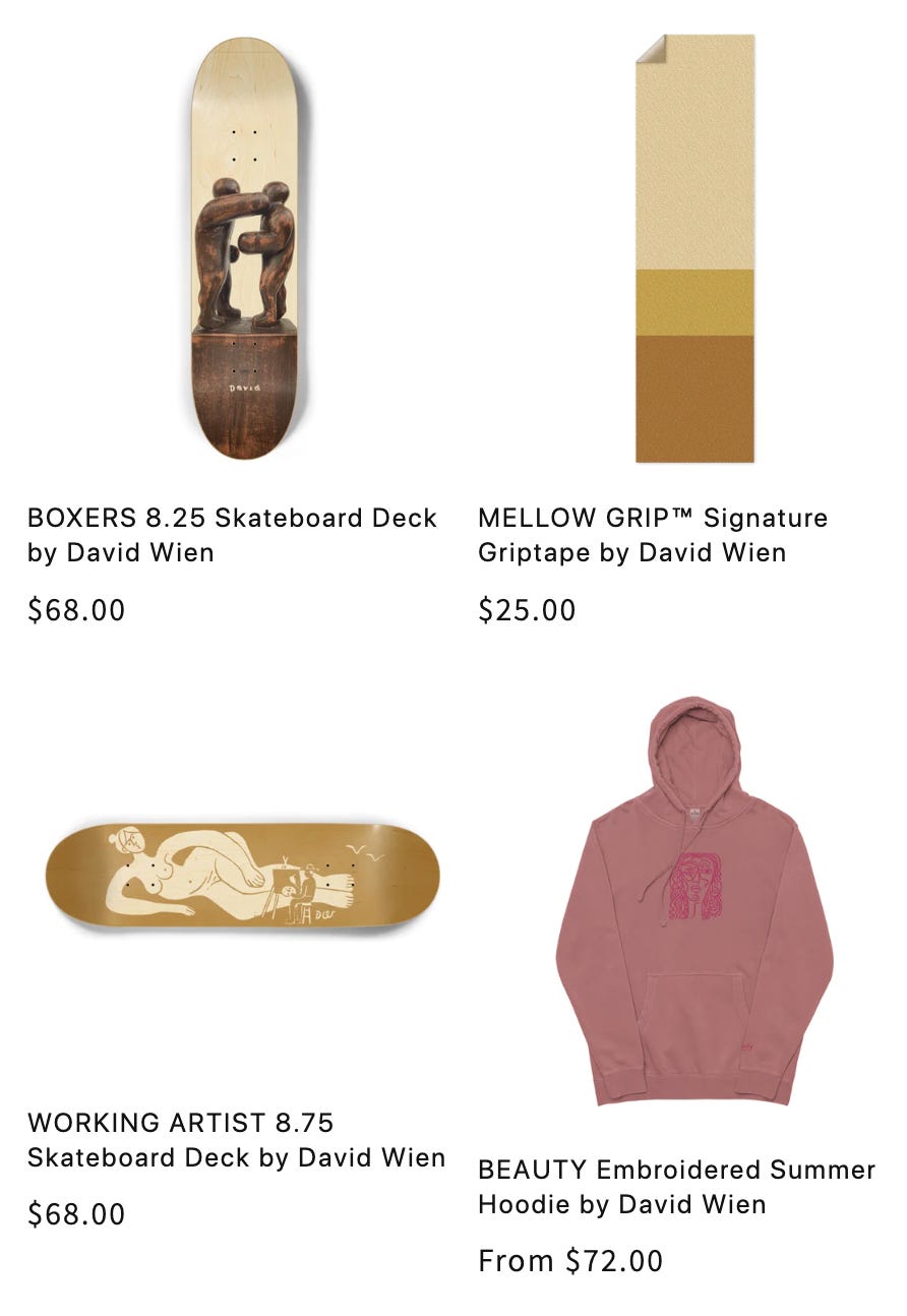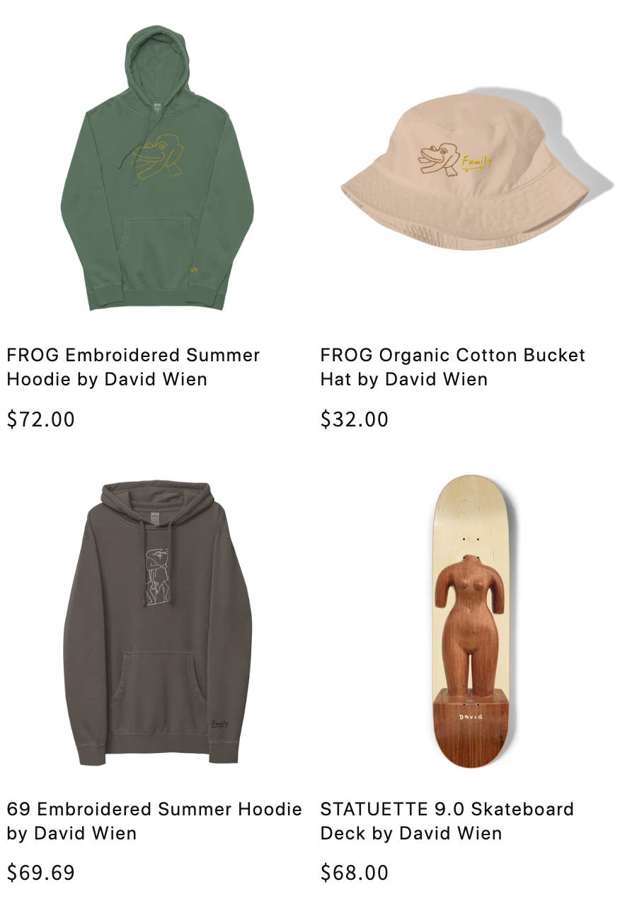 David Wien goes all out for Family! Wood Sculptures, Paintings, Prints, Skateboards, Threads and more.